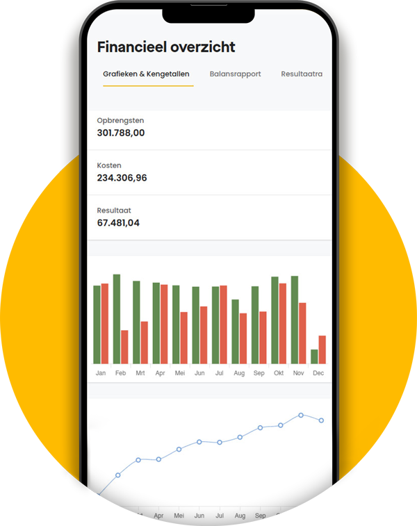 Met één blik zie je hoe je bedrijf ervoor staat: opbrengsten, kosten en resultaat. Rapportages zijn altijd actueel, zodat je grip hebt op je cijfers en nooit voor verrassingen komt te staan.