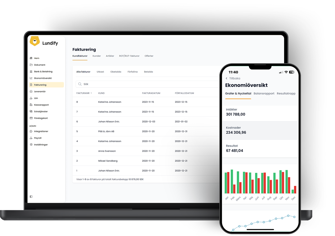 Med Lundify sköter du din fakturering smidigt på webben och i Lundify-appen. Programmet är enkelt att arbeta i och det går snabbt att komma i gång. Då Lundify även innehåller en bokföringsdel sparar du tid genom att du automatiskt får in fakturorna i bokföringen.